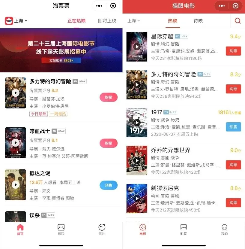 小黑也顺便看了看猫眼电影的小程序,发现这两个直接竞争对手在微信小程序端的设计思路如出一辙,同样砍掉了用作内容推广的“小视频”和演出服务。