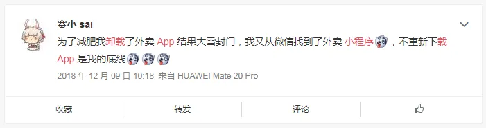 在小程序刚出的时候,小黑卸载过不少手机应用,然而没过多久,又都一个一个装了回来,有的是因为功能缺失,有的是因为使用逻辑不符合日常习惯(比如淘票票那令人发指的账号系统),更多的则是因为便捷度的问题:要找到忘了添加到“我的小程序”的小程序可真是一件体力活,而且在浏览小程序的时候,别人发来的微信除了振动之外,都是没有提示的。如果是妹子发来的约会邀约你没看到也就罢了,要是没看到老板发来的加班通知误了大事可怎么得了(赶紧狗头保命)。