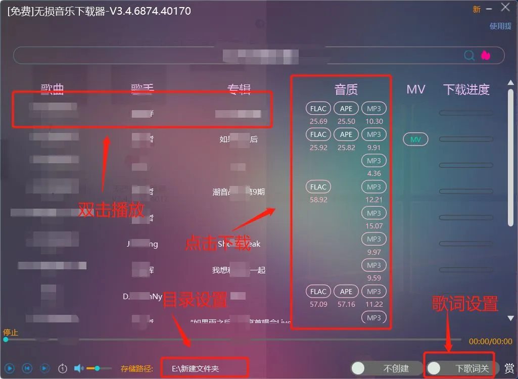 双击播放,点击下载,设置目录,设置歌词。