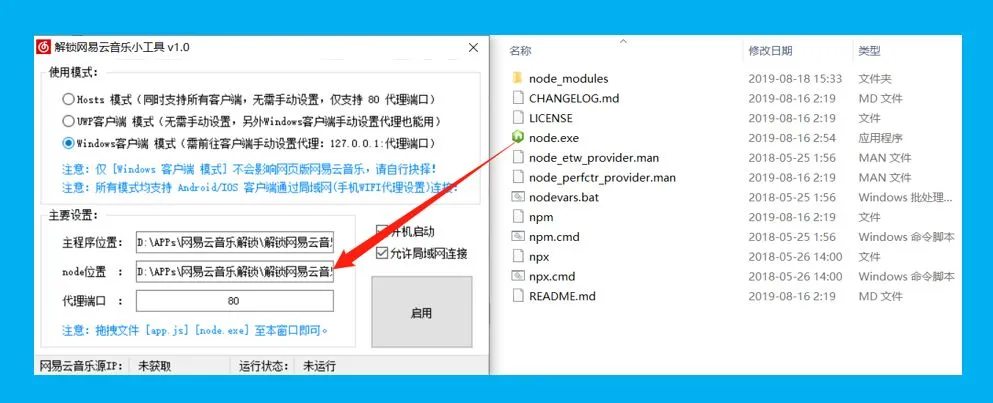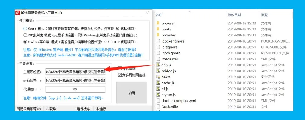 将“UnblockNeteaseMusic-master”文件夹中的“app.js”文件拖拽到解锁小工具的第一行;