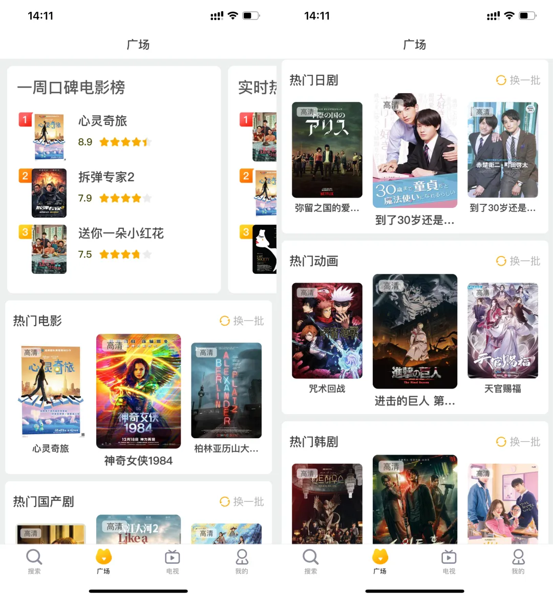 从上图可以看出,搜索界面也提供了当下非常多的热门视频供大家直接观看,广场频道也有很多热门电影和电视剧,都是目前热映的电影和电视剧,电视剧包括国产、日韩、欧美等应有尽有。