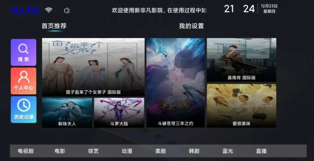 新非凡影院打开默认为横屏模式,完美支持遥控器操控,当前免费使用,安装在智能电视或者盒子等大屏设备上看片、追剧非常舒适。