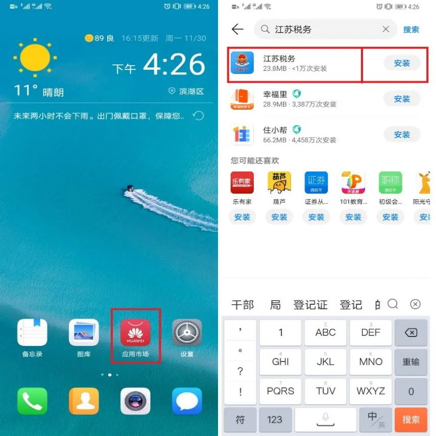 以华为应用市场为例,打开华为应用市场,搜索“江苏税务”,点击【安装】、【打开】。