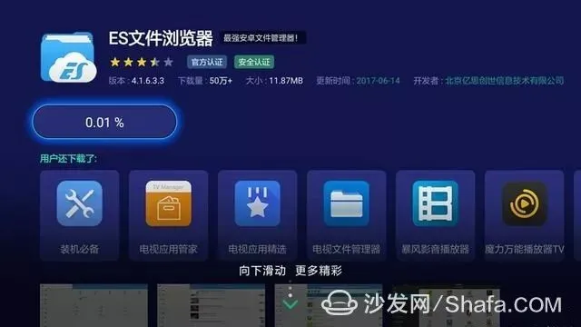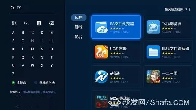 1、打开智能电视(或电视盒子)里的沙发管家,搜索“ES文件管理器”下载安装(如果没有沙发管家,可以百度搜索下载到U盘安装)