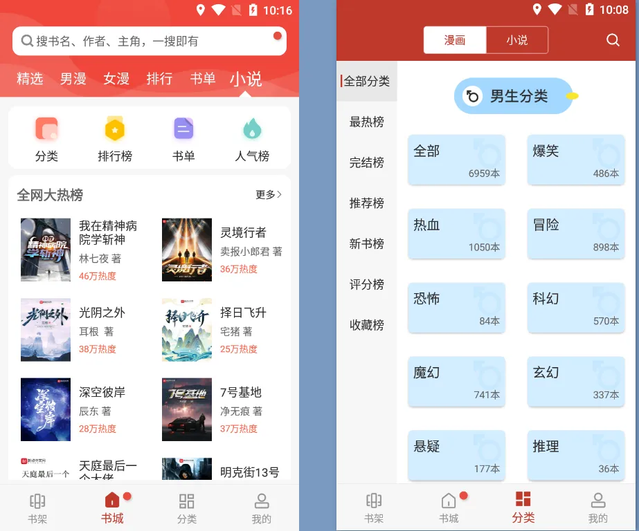 首页男漫、女漫、小说频道,满足用户不同的观看需求,软件风格简洁,进入APP,即可立即进入漫画世界,欣赏各种优质漫画内容。