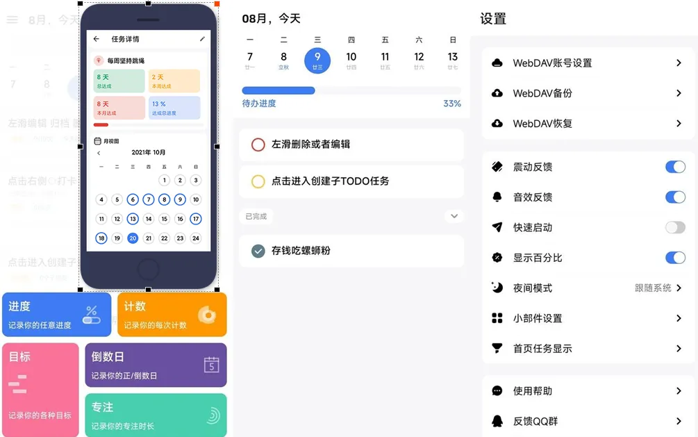 它能帮助你养成自我管理的习惯,快速完成计划。简单易用的界面给你带来愉悦的体验,只需点击 “+”或”-“即可更新进度,帮助你实现目标。