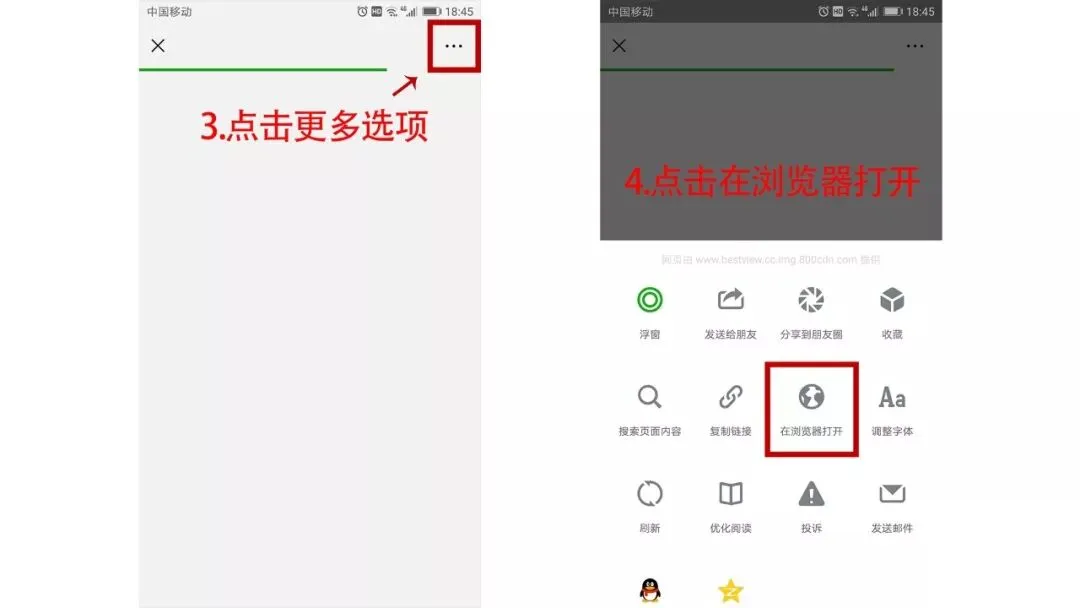 第三步:扫描后进入微信网络页面,这时候点击右上方的更多选项,第四步:在更多选项中找到在浏览器打开,点击。