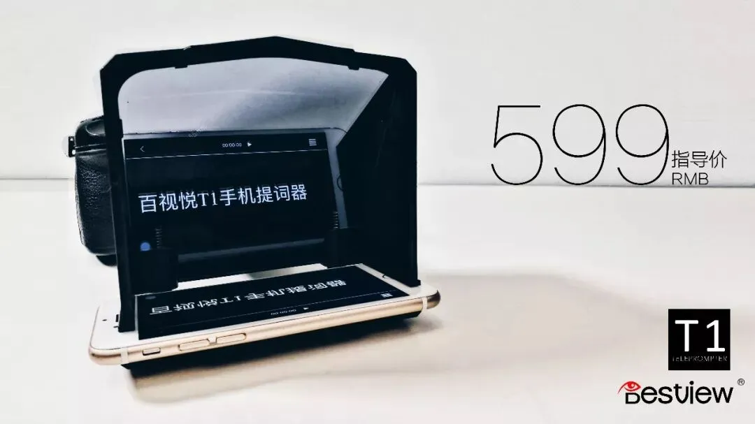 百视悦T1手机提词器破天荒的将提词系统与手机结合,一改传统型提词器的庞大体积以及复杂的组成结构;把提词器的体积浓缩到最小化,将手机作为提词系统的载体,搭配T1专用app映射文稿,让每一位用户随时随地皆能用上提词器。