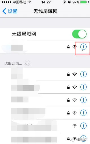 9.点开之后,点击自己所连wifi旁边的”i“选项。