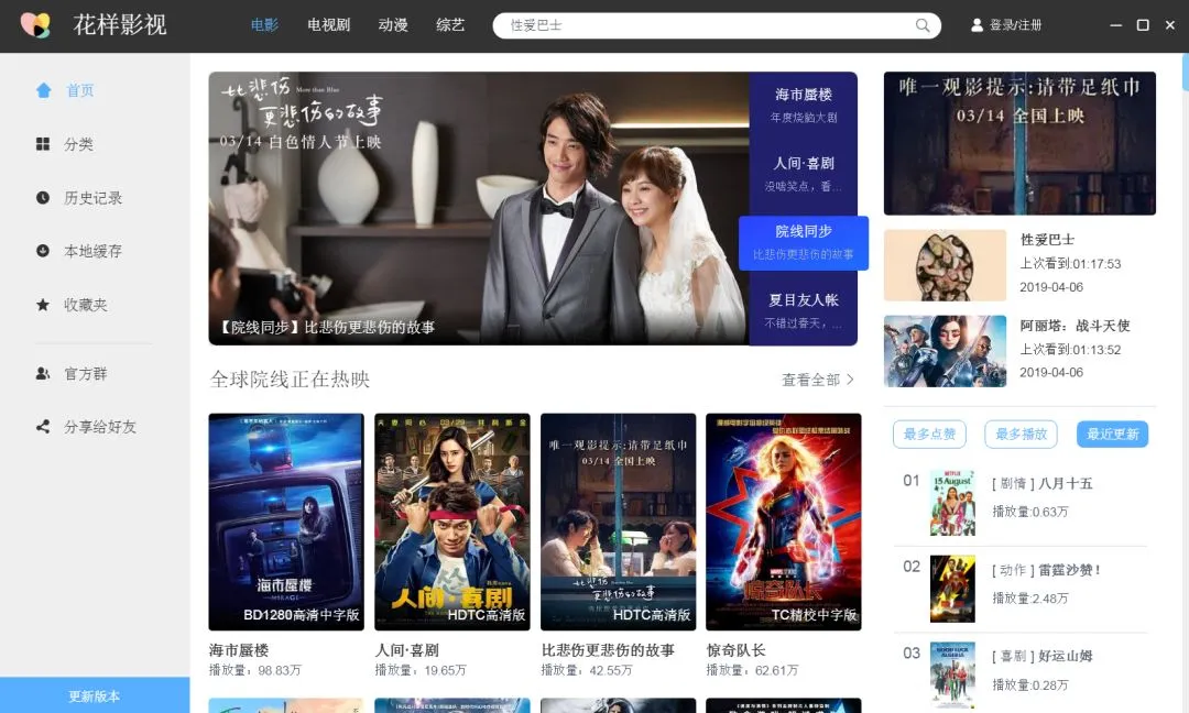 更新的速度很快,大多是官方同步更新的,视频按照时间、地区以及类型进行分类,支持视频的缓存。