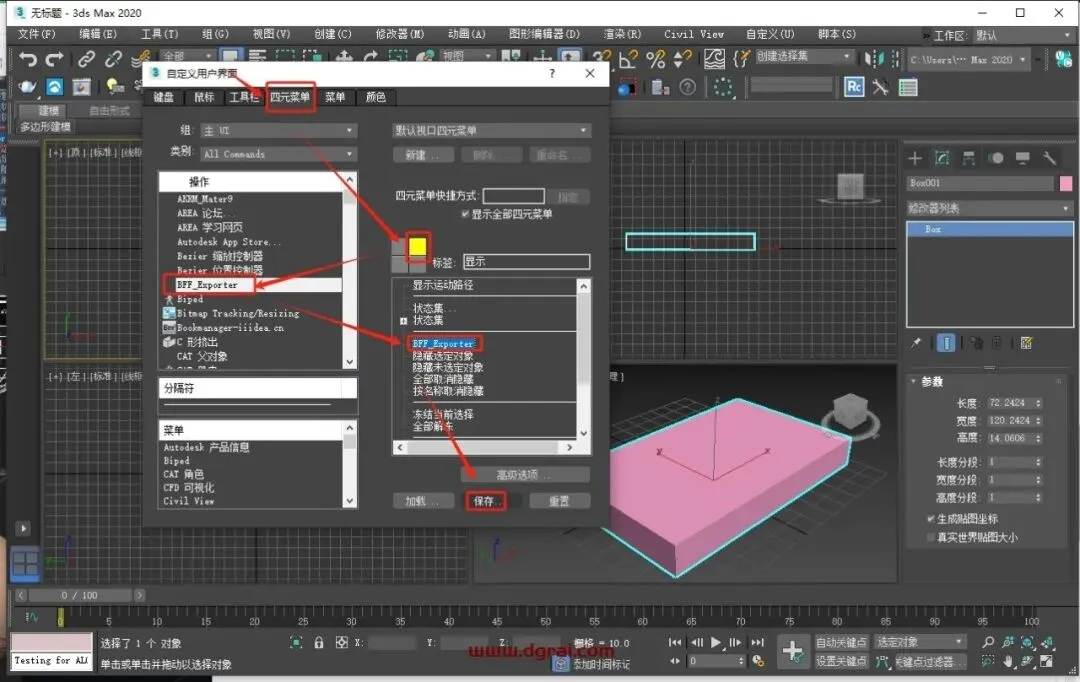 点击【四元菜单】,再点击四边形右上,然后在操作里面找到BFF_Exporter,拖动到右侧隐藏选定对象上面,最后保存