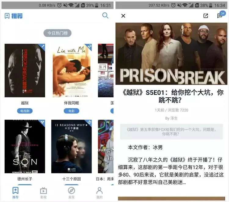 推荐中可以看到每天的热门榜,这几天排在第一的自然是阔别八年回归的《越狱》第五季。还有影视推荐的内容,主要是一些资讯文章,有影评、剧评、新闻等。