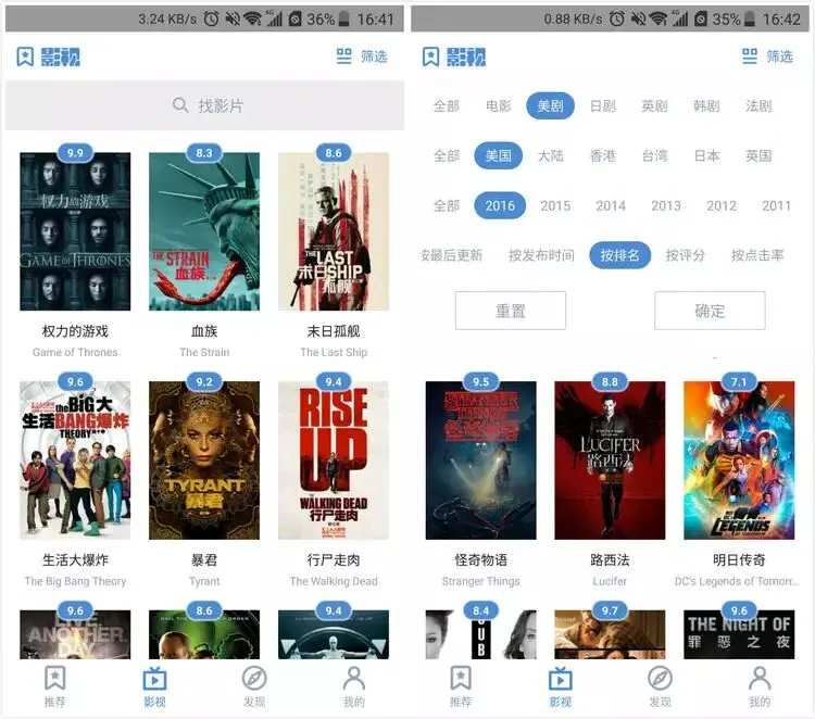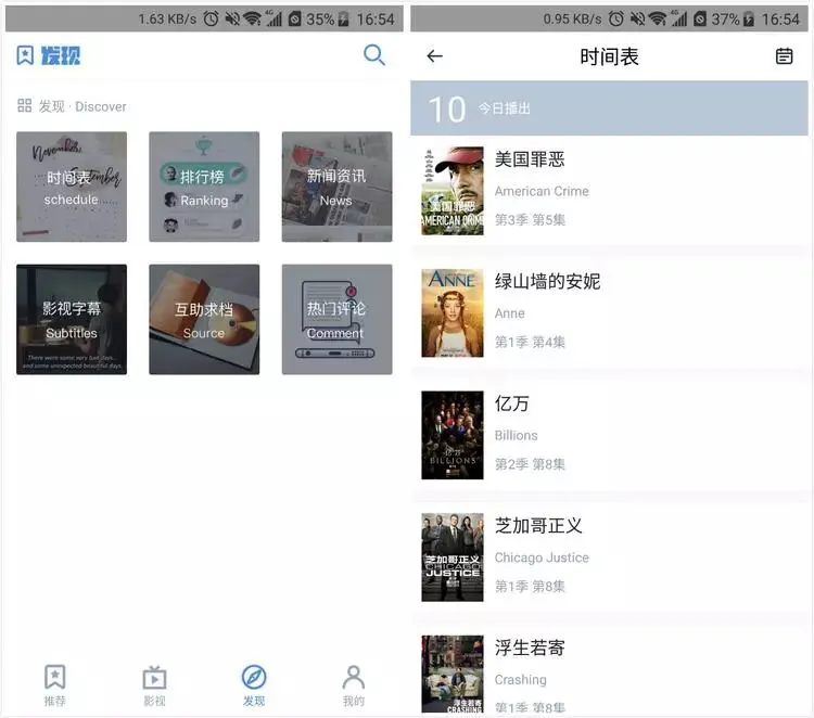 具体的播出情况可以在发现中的时间表中查看。如果想看看哪些剧集最受欢迎,可以在排行榜中查看大家收藏和浏览最多的剧集,看一周或一月的数据就可以知道最近流行哪些美剧。新闻资讯、影视字幕等功能也在开发中。