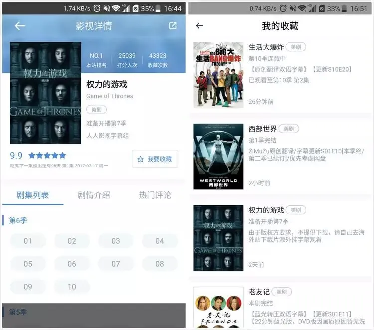 点进影视详情会显示剧集列表、剧集介绍、热门评论,海报下方会显示目前的更新状态,以及下一集的播出时间等信息。把喜欢的剧集收藏,可以随时了解动态。