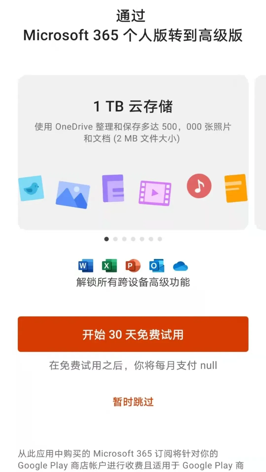 安装打开之后,Office会跳出一个“通过Microsoft 365个人版转到高级版”的通知,在这里选择暂时跳过就好了