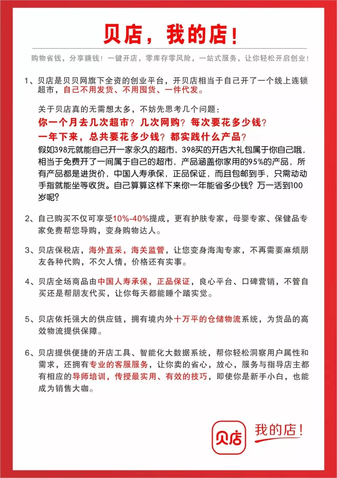 如果你错过了淘宝,错过了微商,那千万不要错过贝店!一起在互联网浪潮中,在如火如荼的社交电商道路上分一杯羹!现在开始,一切都不晚!最大的时间成本就是观望!
