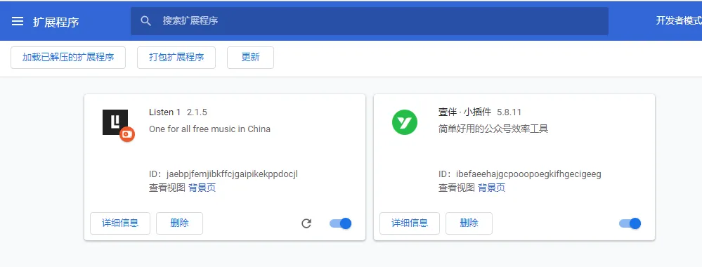 在扩展程序设置页面在右上角找到「开发者模式」并打上勾