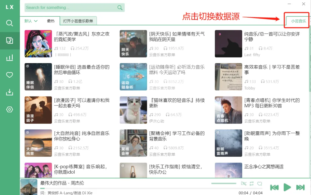 除了可以搜索音乐、各大平台推荐歌单以外,洛雪音乐助手还收录了各大音乐平台的“音乐播放列表”、“排行榜”,比如飙升榜、新歌榜、热歌榜等等,以便你实时找到当下最流行的音乐