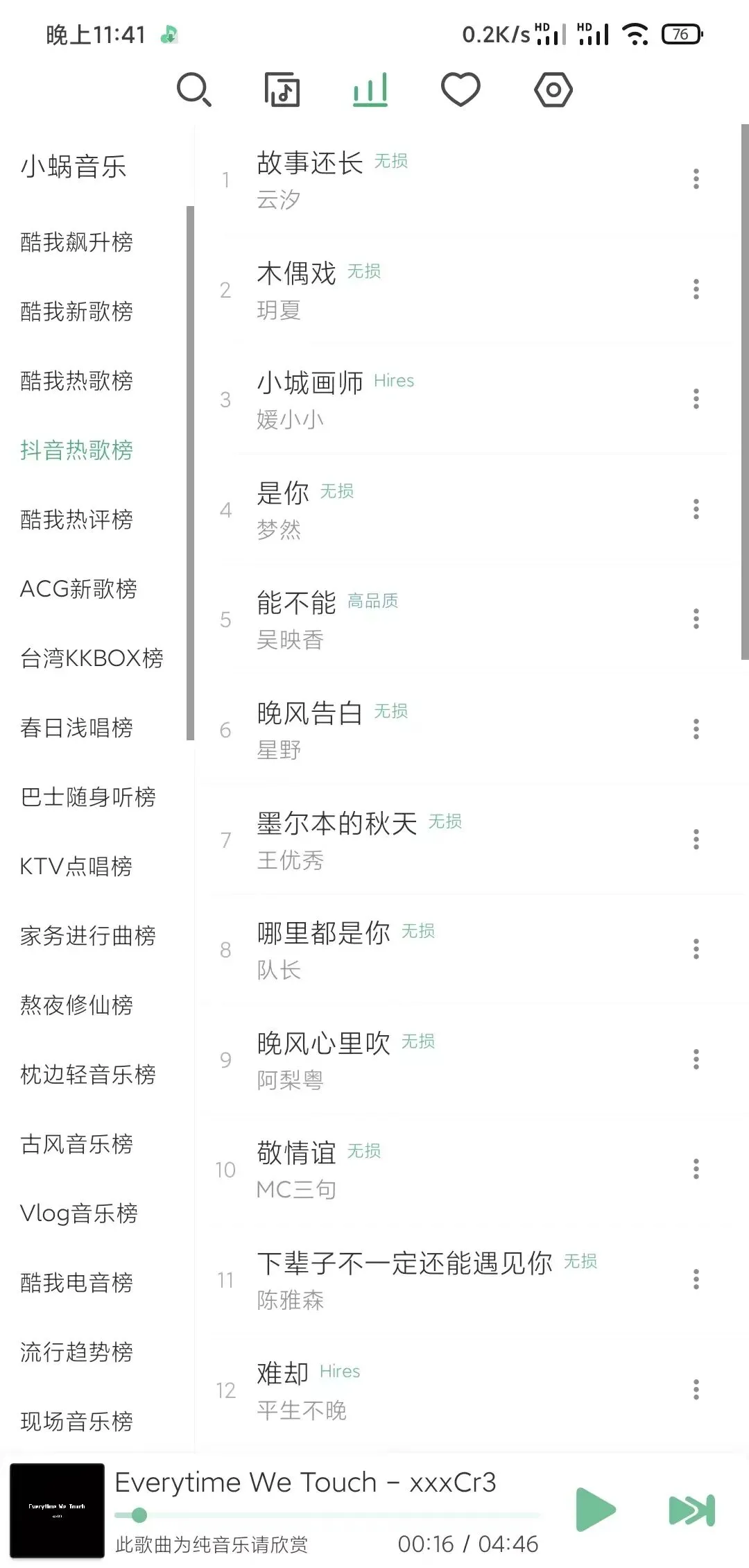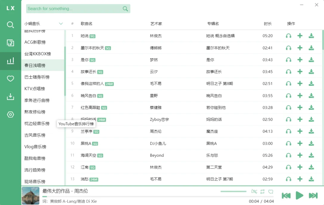 权威性的音乐榜单,让你随时紧跟音乐潮流,还支持某云音乐、某Q音乐、某狗音乐和某我音乐4大音乐平台的排行榜榜单切换。