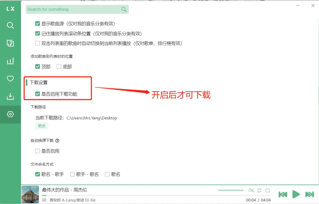 如果你想下载无损音乐,你需要在”设置”页面->勾选”下载设置”启用下载功能,默认是不开启的