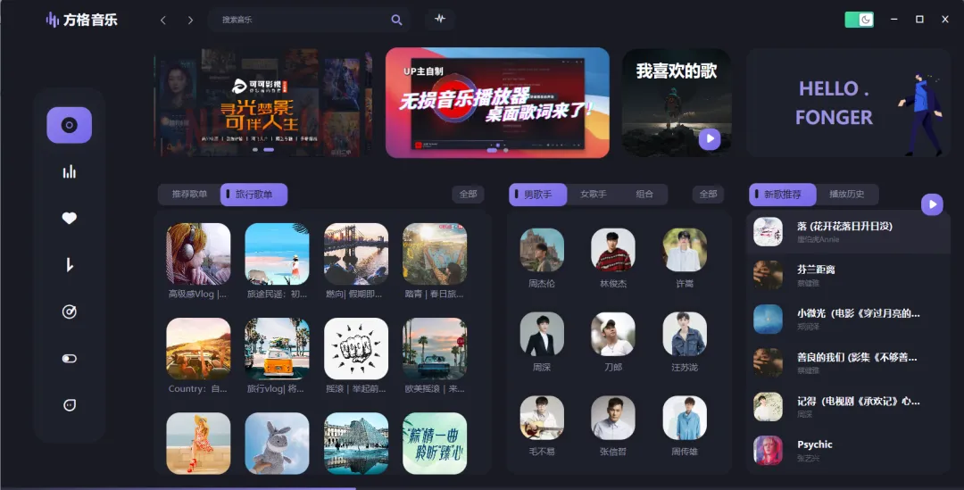 推荐一款强大的PC端音乐软件——方格音乐,提供有丰富的音乐资源和个性化推荐功能。软件的UI设计简洁时尚,支持黑白两种色调切换.内置多种音源。