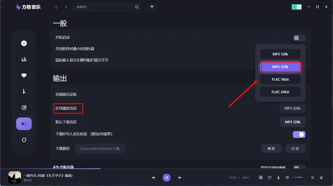 默认在线播放音质是标准音质(320K),想追求极致音质体验的可以在设置中切换成FLAC。