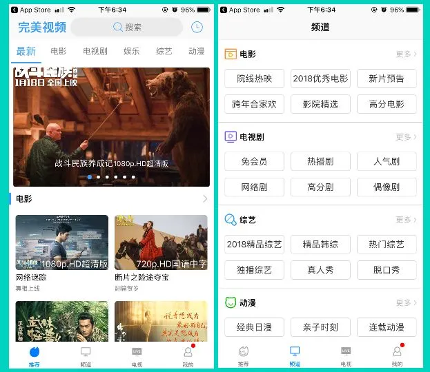 进入软件首页,我们就会看到这真的是一款完美看视频的APP,拥有电影,电视剧,娱乐综艺,动漫等海量影视资源,而且打开视频没有任何广告,非常流畅,比起那些通过分享才能观看和太多广告的影视软件,完美视频算是非常良心了。