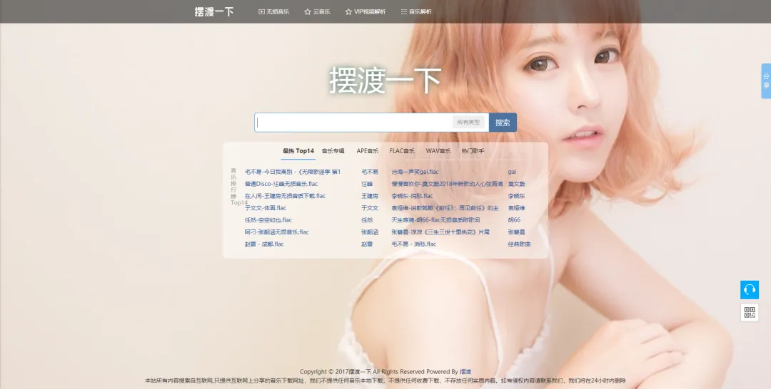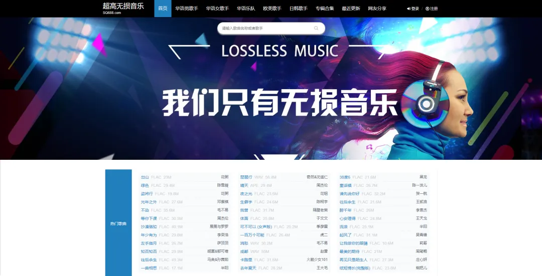 相比上面那个,SQ688页面显得更直接,首页直接给出了所有的分类,首页banner也是给出了“我们只有无损音乐”的说明。当然,我们这篇图文主题就是PC端无损音乐啊。