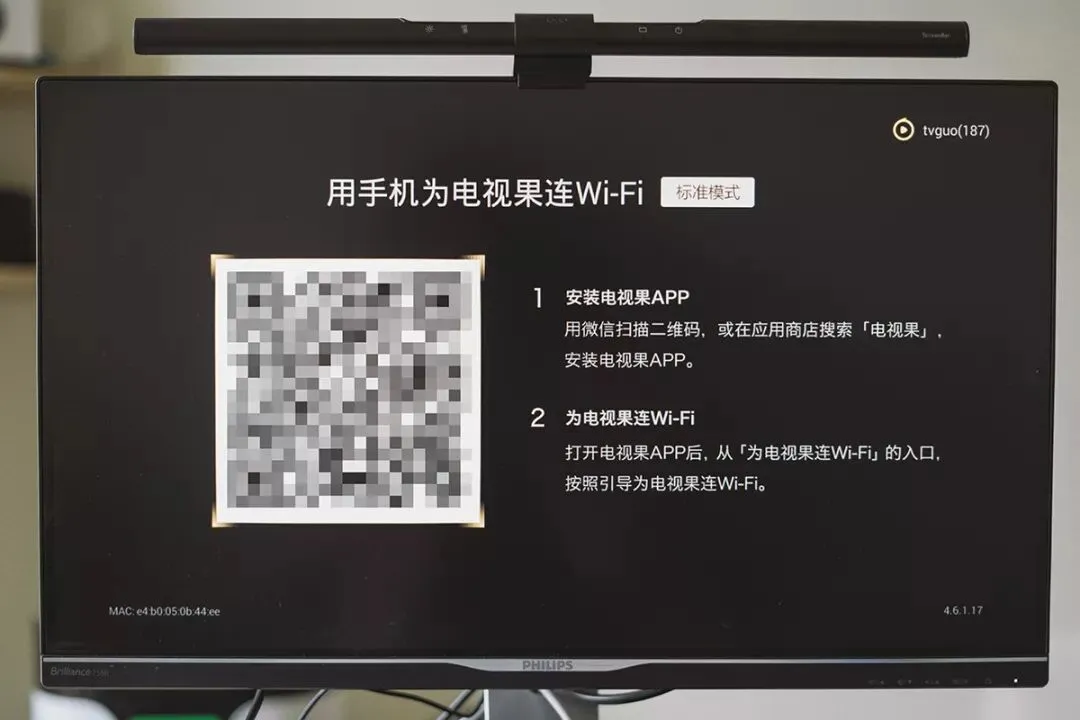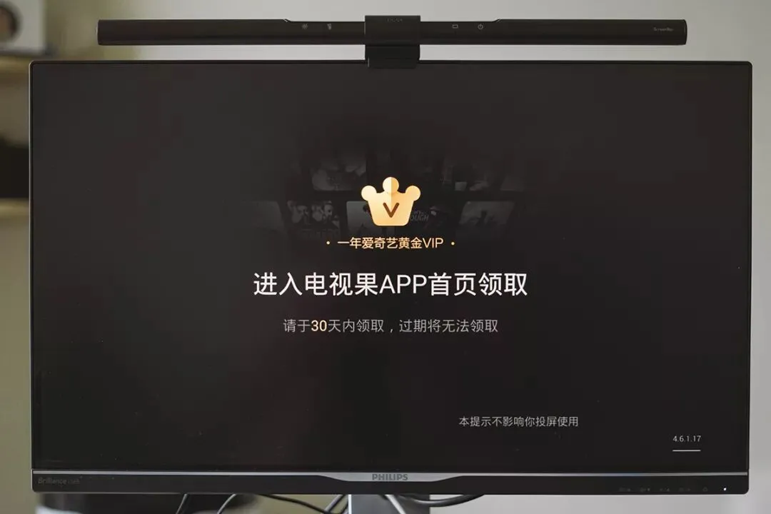 电视果通电会以后自动开机,调整好显示屏的信号源,接着扫描屏幕上的二维码进行APP下载安装并连接好家里的WiFi。基本工作完成以后,屏幕上就会提醒我该去领一年份的爱奇艺VIP会员服务啦!