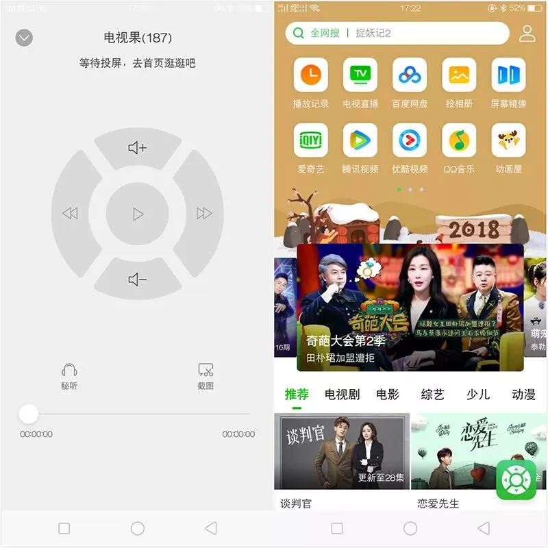 手机端的APP名字就叫做“电视果”,APP主页面右下角的绿色悬浮图标就是虚拟遥控器。注意看主页面上部分那些视频,电视果3可是支持很多家视频网站的投屏操作。除了自家的爱奇艺之外,还有优酷、芒果、腾讯视频AcFun和bilibili等。更为惊喜的是,电视果3 VIP版能看电视直播和百度网盘,这是智能电视和电视盒子无法观看的。