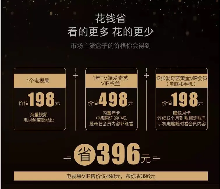 例如这张图片所显示的,我单独买一个电视果需要198元,但是我还得买VIP会员啊,TV端的会员加上手机端的会员费用是696元了!而我只花498元买一个电视果3VIP版,就有了一年份的TV端会员和手机端会员,这样一来我就可以省396元了哦!而且手机端会员还可以在电脑端和Pad上使用通用。