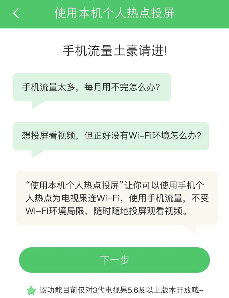 电视果3VIP版还有一个功能,在手机流量多的用不完的情况下,电视果可以不用WIFIWiFi投屏观看视频,直接用手机个人热点进行播放。这个功能特别适合刚从外地打工回来买了新房但是还没有来得及安装宽带的家庭。