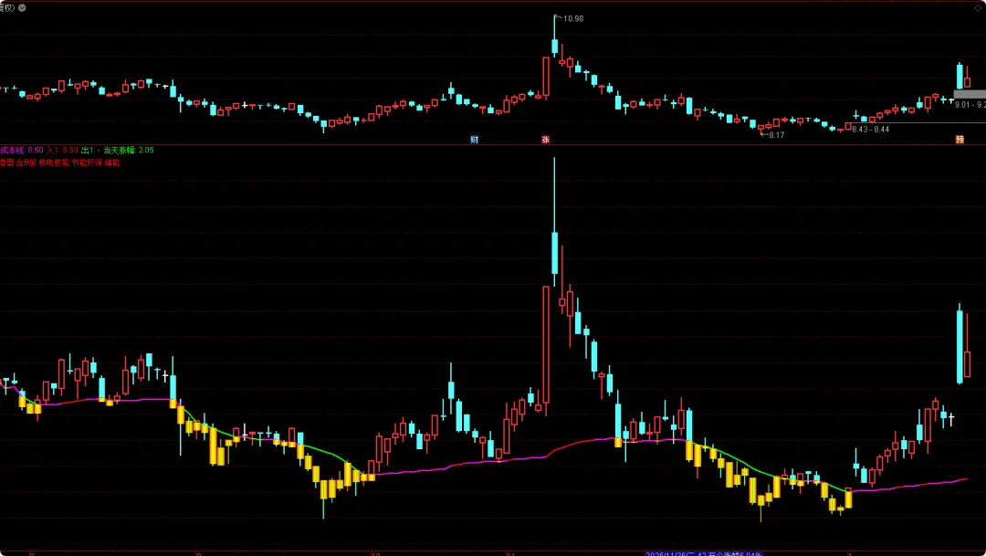 STICKLINE(成本线>LOW AND 成本线< HIGH,成本线,MIN(MIN(OPEN,ZBM0),成本线),2.5,0)*ZBM4,COLOR0099FF;