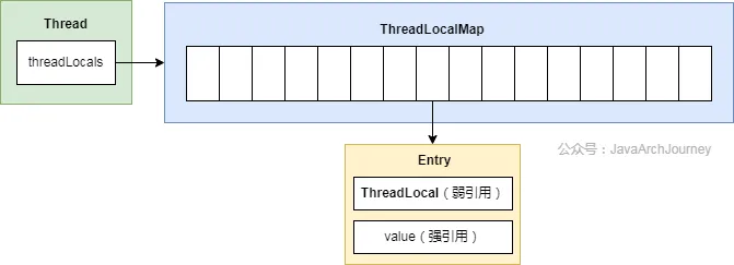 ThreadLocal 本身不存储值,而是把自身 (this)作为 key 存入当前线程的 ThreadLocal.ThreadLocalMap类型的字段 threadLocals。当调用 threadLocal.get() 时,实际是 Thread.currentThread().threadLocals.get(this)。