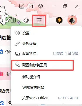 1.直接先打开软件,右上角看下图的设置按钮,点击后选择 配置和修复工具