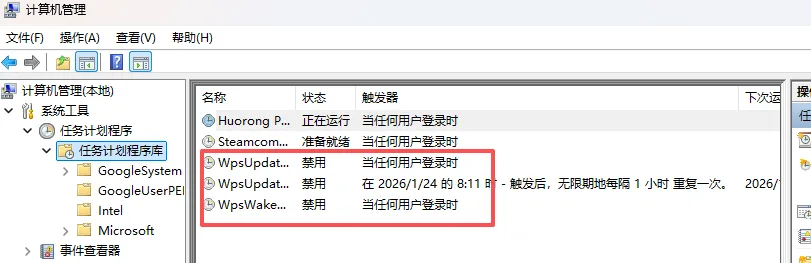 此电脑右键 –> 管理 –> 系统工具 –> 任务计划程序库 –> 找到 WpsUpdateLogonTask_Administrator WpsUpdateTask_Administrator WpsWakeWnsLogonTask