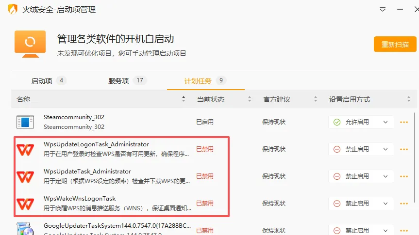 打开火绒,没有最好删除其他安全软件装一个,真心好用。打开开机启动项管理,找到计划任务,禁用所有wps的选项,按需禁用其他项。
