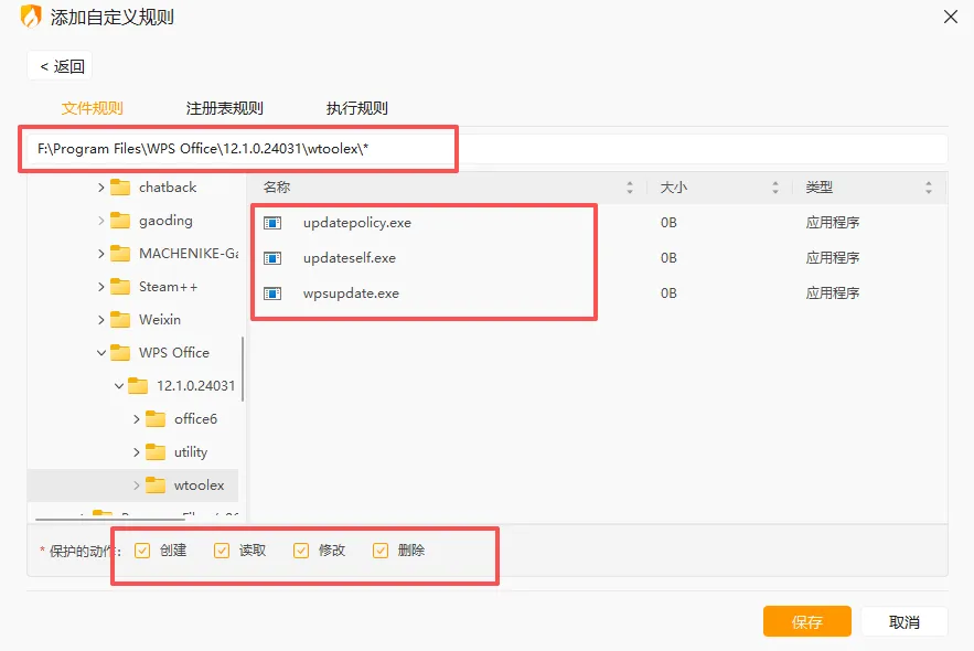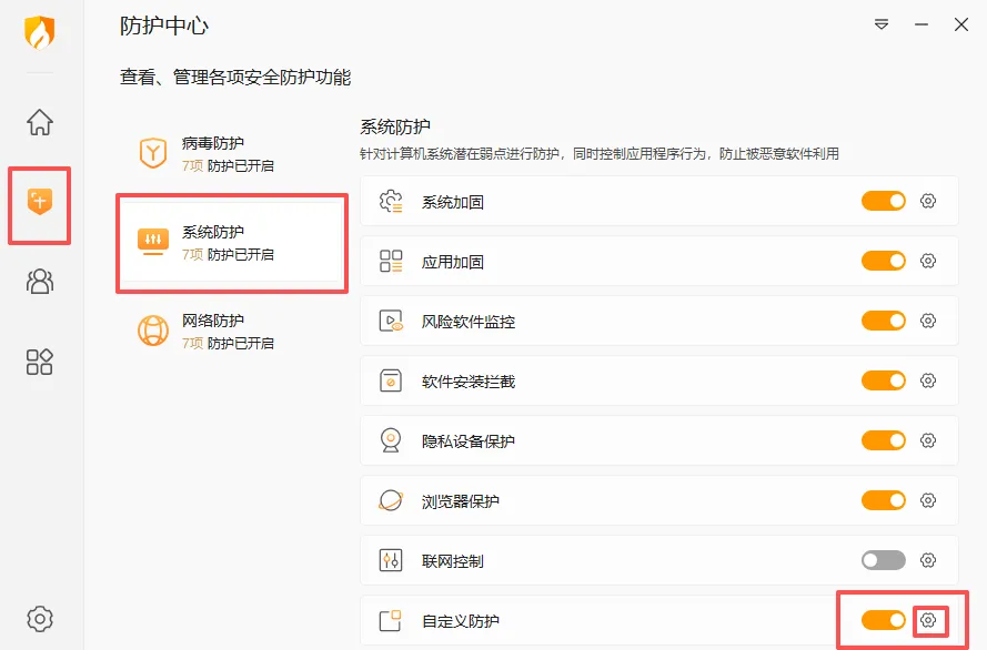 4. 打开火绒 ->防护中心-> 系统防护-> 自定义防护 按钮打开再点击旁边的设置图标 -> 系统防护 ->自定义防护 ->添加 ->添加保护对象 这里下面选直接阻止,然后打开刚才替换目录,三个文件依次加一遍,勾选下面的保护动作。