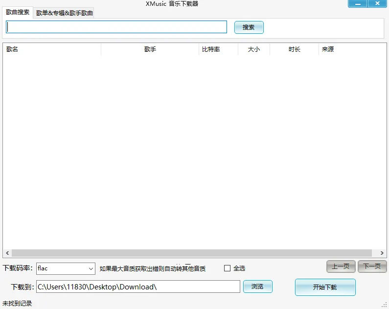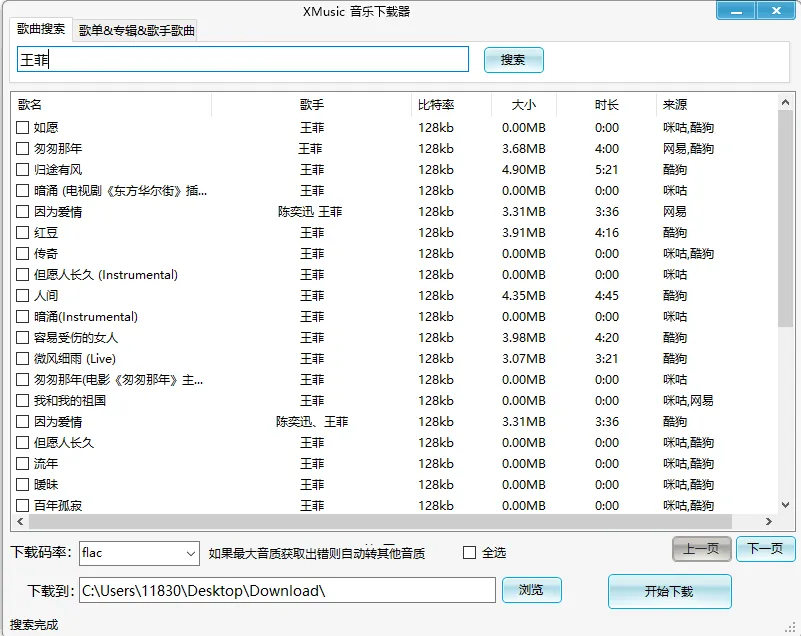 可以直接在主页搜索框输入歌手或歌名进行搜索,可以单选下载,也可以勾选”全选”批量下载,选中要下载的歌曲后,点击”开始下载”即可下载,速度极快。下载歌曲默认为无损音质,下载完成后的歌曲保存在桌面上的一个名为”Download”的文件夹里。