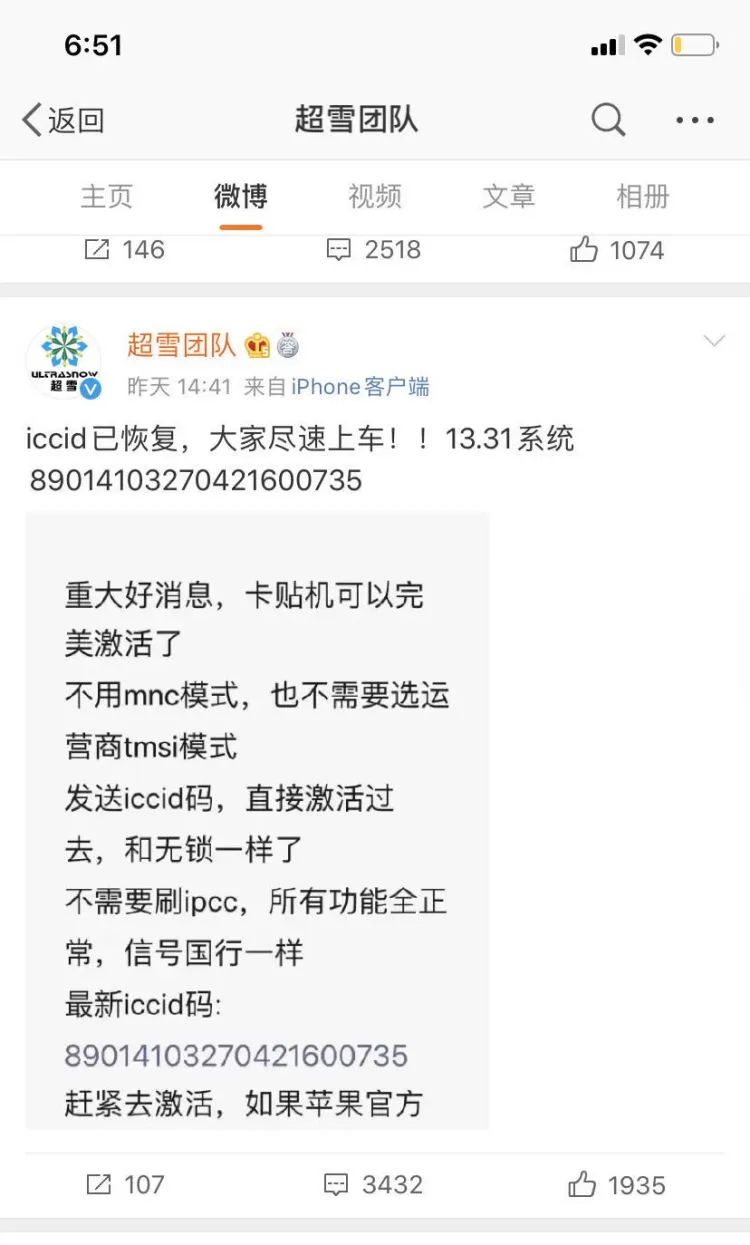3月11日下午,超雪团队在发博称,iPhone卡贴机已经恢复了,发送ICCID码可直接激活,信号与国行一样,并提醒大家抓紧时间激活,如果苹果再次封堵将失效。
