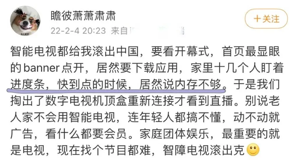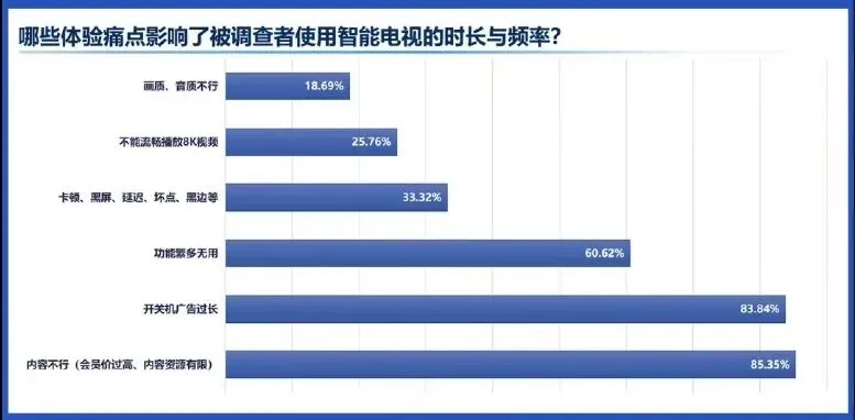 去年人民网财经研究院发布的《2021年智能电视消费者使用痛点调研报告》显示,83.8%的消费者认为“开关机广告过长”是使用智能电视的最大痛点。