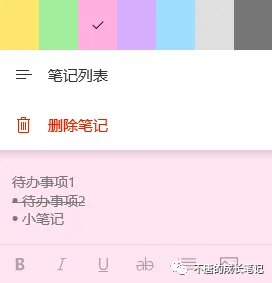功能:7种便笺颜色 | 加粗 | 倾斜 | 下划线 | 删除线 | 项目符号 | 插入图片。