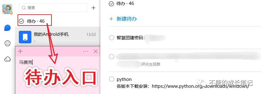 待办事项: 常用在保存QQ群里一些可能用到的通知,或者重要信息。 #有一阵子,学校老折腾改密码,消息就转为待办保存起来方便查看。