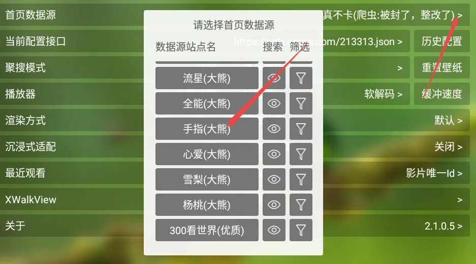 点击首页数据源会弹出窗口,往下面翻页就可以找到站点了,有些站点有首页源,有些没有,这个你自己测试,小q随便测试的是手指