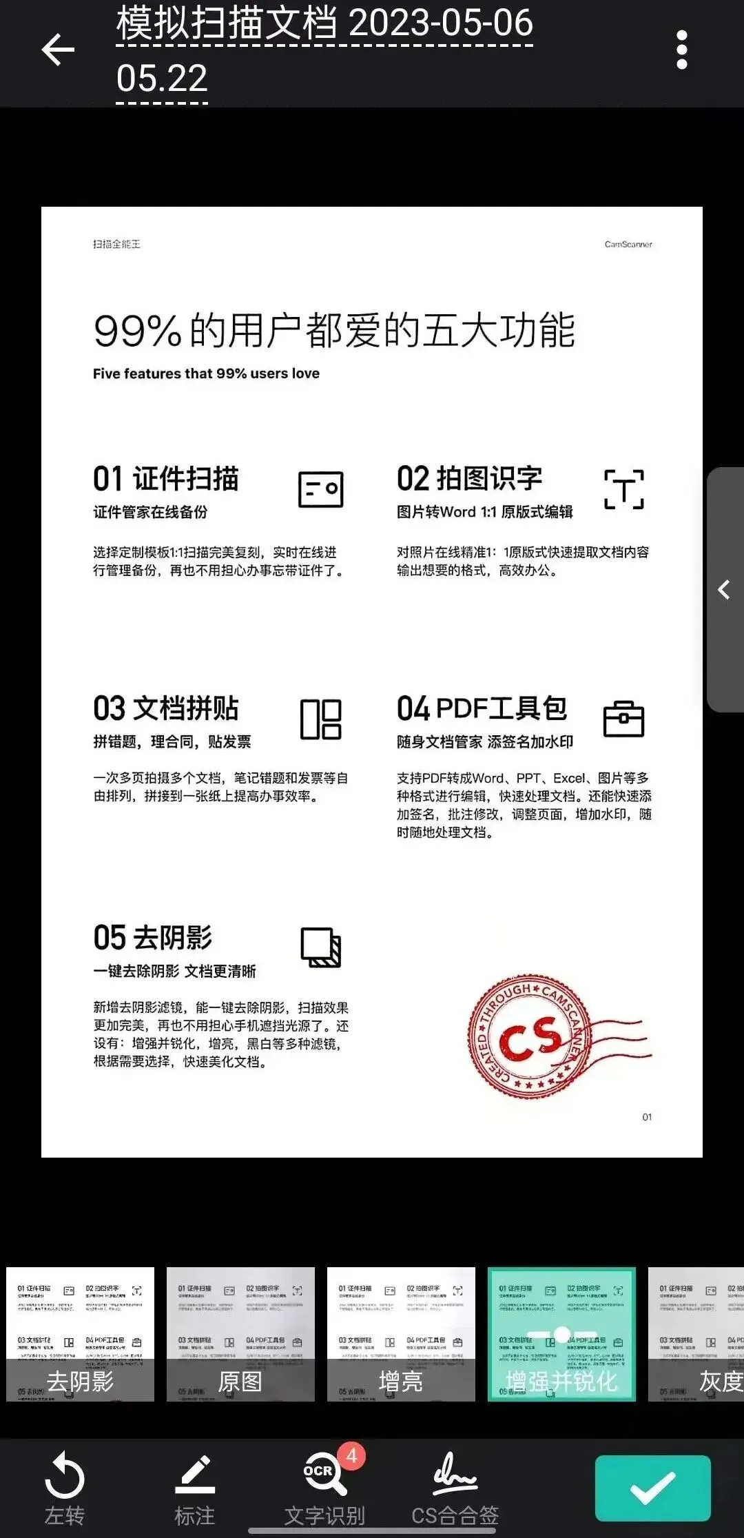 拍文件自动矫正歪扭纸张,手写体、印刷字都能增强,比手机自带相机清楚 10 倍;格式随便转