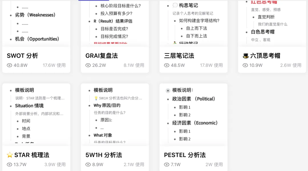 在这个APP里,还有各种建立好的思维模板、学习工具模板等等,比如SWOT分析、5W1H法等等:
