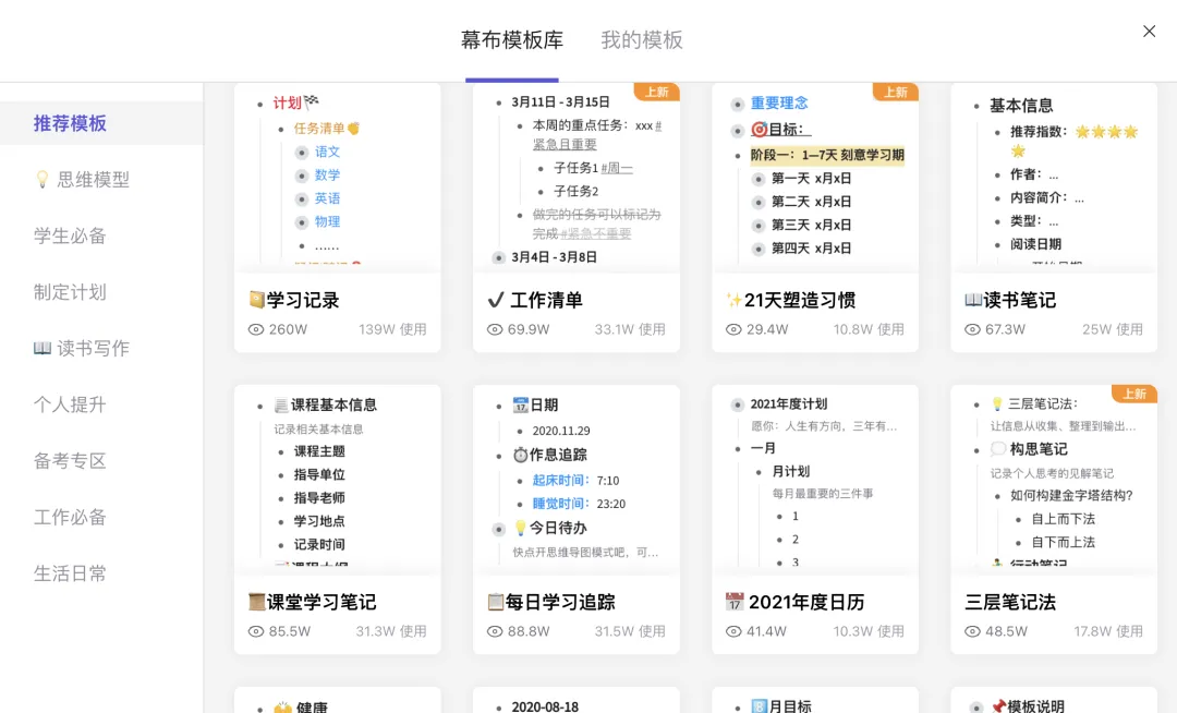 在模板中,还有许多工作计划、习惯养成、会议记录、读书笔记等很多很多的模板。