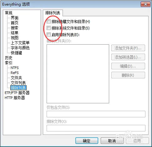 如图所示,选择”工具“–”选项“,进入设置菜单,将图中圈圈中所示的3个小框全部打成”☑“然后点击确定。同时通过”添加筛选器“选项把平时用不要的系统文件全部输入进去(警告:这个需要根据自己的情况添加),这样有助于较少系统文件的显示。