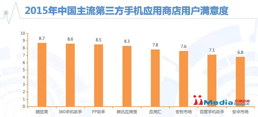 艾媒数据显示,2015中国主流第三方手机应用商店用户满意度上,豌豆荚以其简洁干净的特色也获得8.7的用户满意度排名第一,360手机助手以8.6紧随其后,PP助手排名第三,用户满意度8.5。前三名在应用的质量、内容、品牌力、设计、应用权限等方面更加优化和全面,得到更多用户青睐。