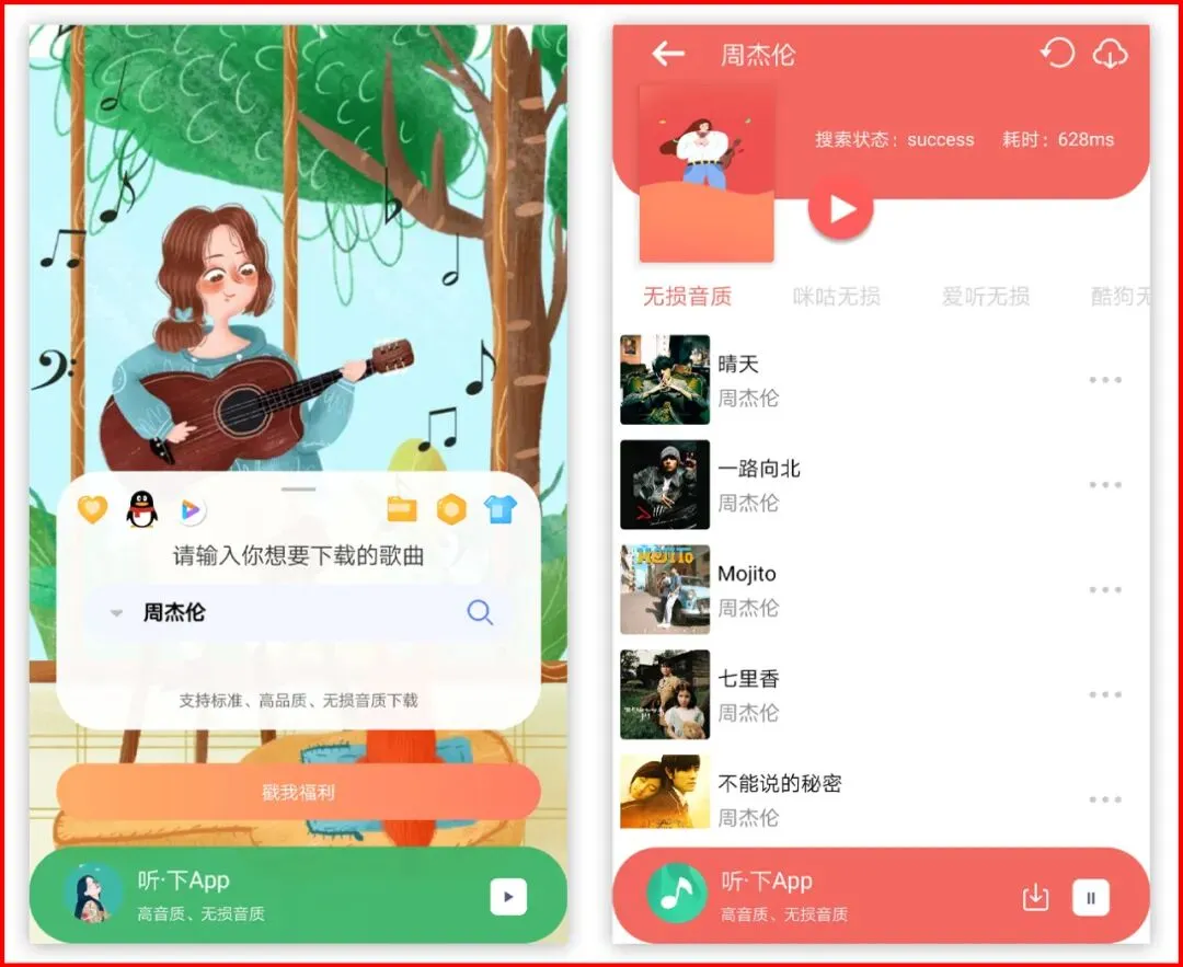 听下也是一款比较优秀的安卓端无损音乐下载App,界面也比较简单,可以更换皮肤,但与魔音完全属于两种不同风格,后者没有歌单,只能通过搜索试听、下载,所以可以说是一款比较纯粹的下载App;